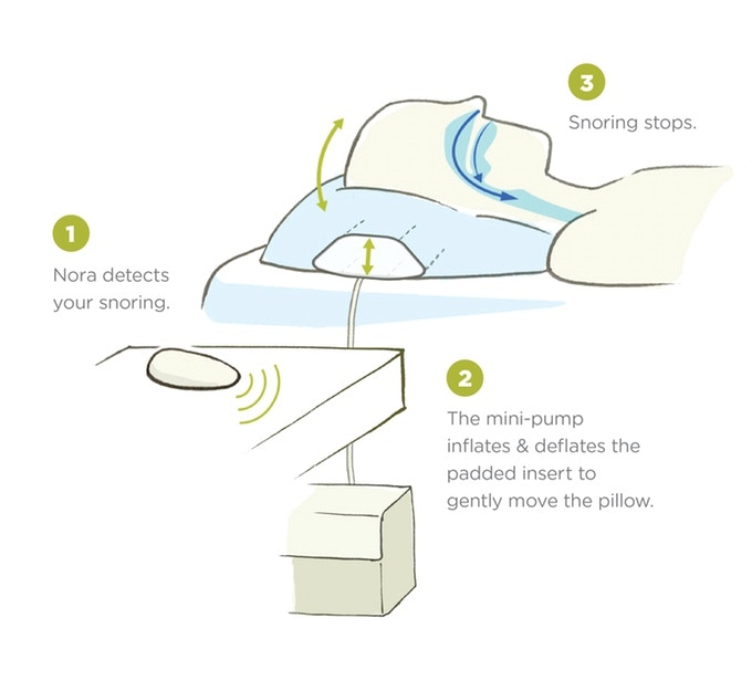 Nora的原理是通过给枕头内的空气气囊充气,缓慢改变打鼾者头部的位置,从而打开喉咙内的空气通道,鼾声就不见了。整个过程十分轻柔、安静,不会将用户和身边的人吵醒。