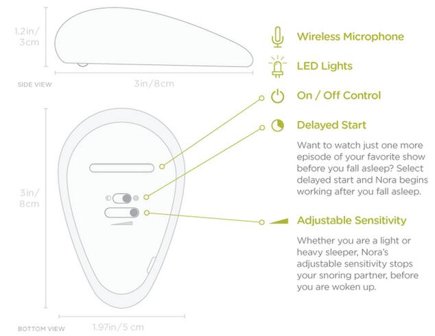 Nora共有三部分组成:鼾声接收器,气囊和充气泵。