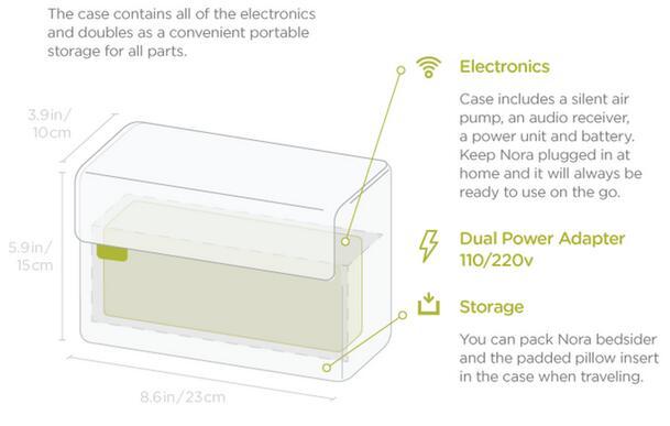 这些设备虽然看起来复杂,但是使用起来却很方便。只要在睡前将气囊放入枕头内部,点击接收器上的开关按钮,就可以安心入睡了。Nora为这些设备配备了一个小巧的箱子,使用的时候把充气泵放入其中,整齐不碍眼。旅行的时候还可以轻松携带。