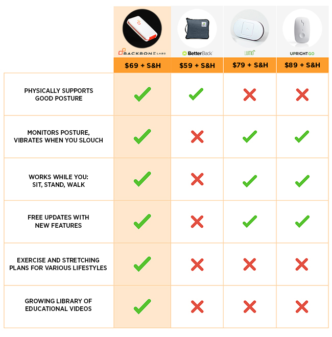 从下图我们可以看出,在姿势矫正、振动提醒、应用场合、自由更新、强化训练、历史记录等方面,BACKBONE都比其他产品胜出一筹,功能更强大。而且性能也很高,耗电较低,每次充电后可以持续几周。